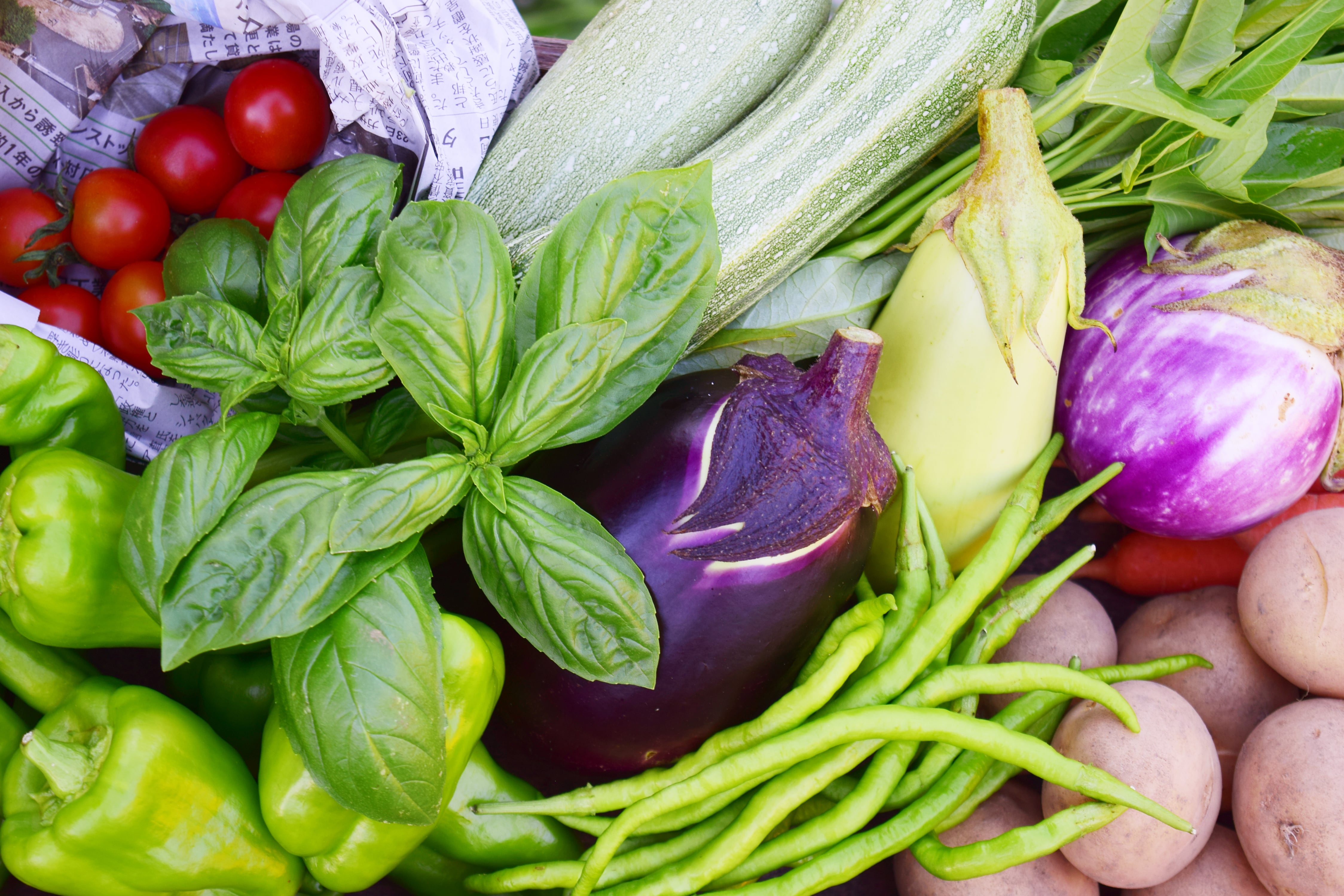 にんじん、ズッキーニ、ミニトマトなどの一般的な野菜に加え、翡翠ナス、ひも唐辛子など普段あまり見かけない野菜も入っています。